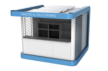 It is equiped with addon such as internet, microphone, speaker, battery for when there no sunlight, display table, shelves and a advertisment placeholder.